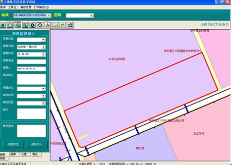 1 影响范围分析:以当前事故点为中心,根据功能窗口上的“紧急隔离半径”和“下风向防备距离”在地图上生成影响范围效果图,红圈表示紧急隔离范围,蓝圈表示防备距离,根据风向的设置,以黄框表示的防备区也将不断进行变化。可通过功能窗口上的信息显示按钮,分别查询三个区域中所有的被影响单位的信息。